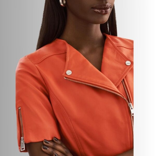 Ce blouson cuir orange présente des manches courtes zippées pour une allure moderne. Sa coupe ample et sa longueur raccourcie ajoutent une touche de dynamisme à votre tenue.