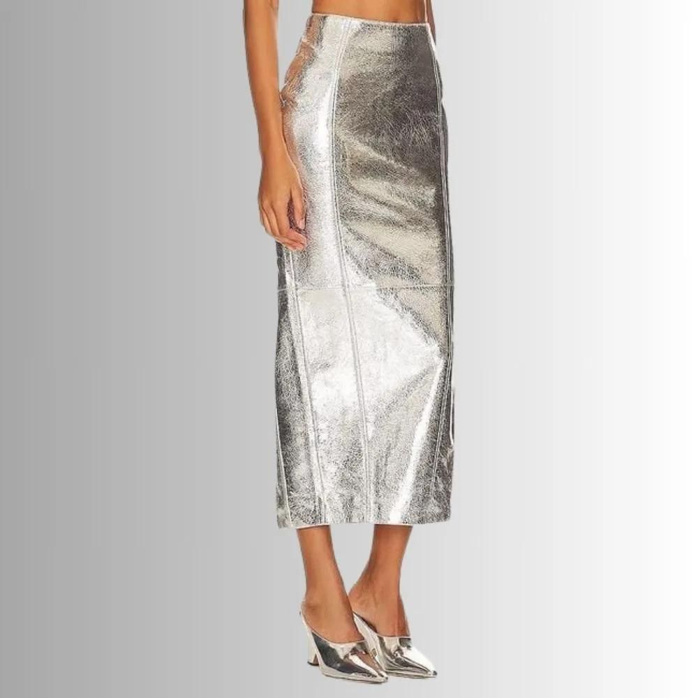 Découvrez notre superbe jupe longue argentée femme, incarnant le glamour et l'opulence des décennies passées. Confectionnée en cuir d'agneau 100%, elle offre une qualité exceptionnelle véritable et une sensation luxueuse. Sa doublure satinée complète assure un confort optimal tout au long de la journée.