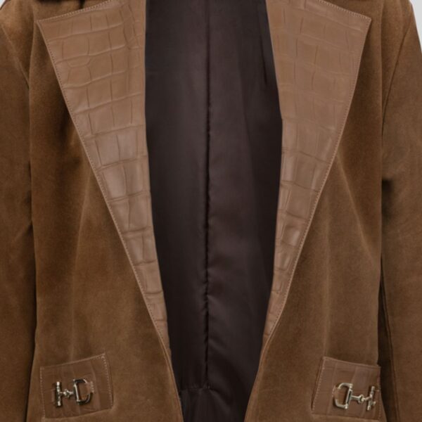 Affirmez votre style avec la veste en cuir et daim femme Royale Contrast, une pièce élégante mêlant textures riches et détails luxueux. Conçue en daim lisse avec un col en cuir embossé façon crocodile, cette veste blazer affiche un design affirmé sans effort.