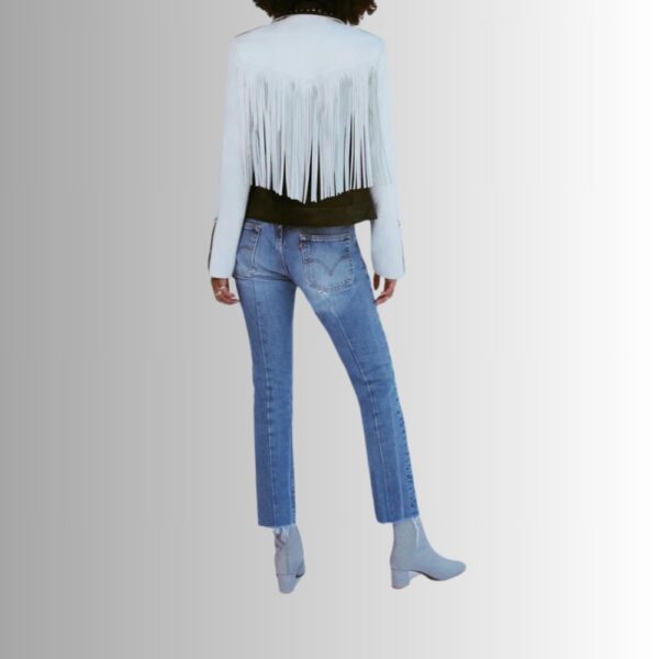 Découvrez notre Veste Cuir Noir Et Blanc, une veste de style biker western, confectionnée à partir de cuir blanc doux, contrasté par du cuir noir brillant. Cette pièce unique se distingue par ses franges à l'arrière, ajoutant une touche de style western authentique.