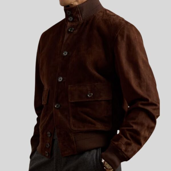 Élégante, structurée et conçue pour les journées fraîches, la veste en daim homme marron foncé Terra Forte offre une silhouette sobre et affirmée. Fabriquée en daim d'agneau haut de gamme, elle se distingue par son col montant montant, ses boutons en corne véritable et sa doublure satinée luxueuse.