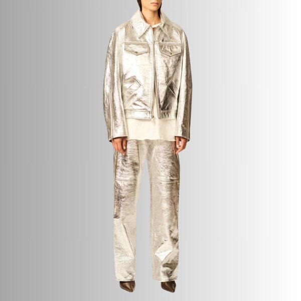 Cette veste au fini métallisé présente un col à revers et une fermeture à glissière sur le devant pour un style moderne et audacieux. Ses manches longues avec poignets zippés ajoutent une touche de sophistication, tandis que les poches à rabat pressionné sur la poitrine et les poches latérales offrent fonctionnalité et style.