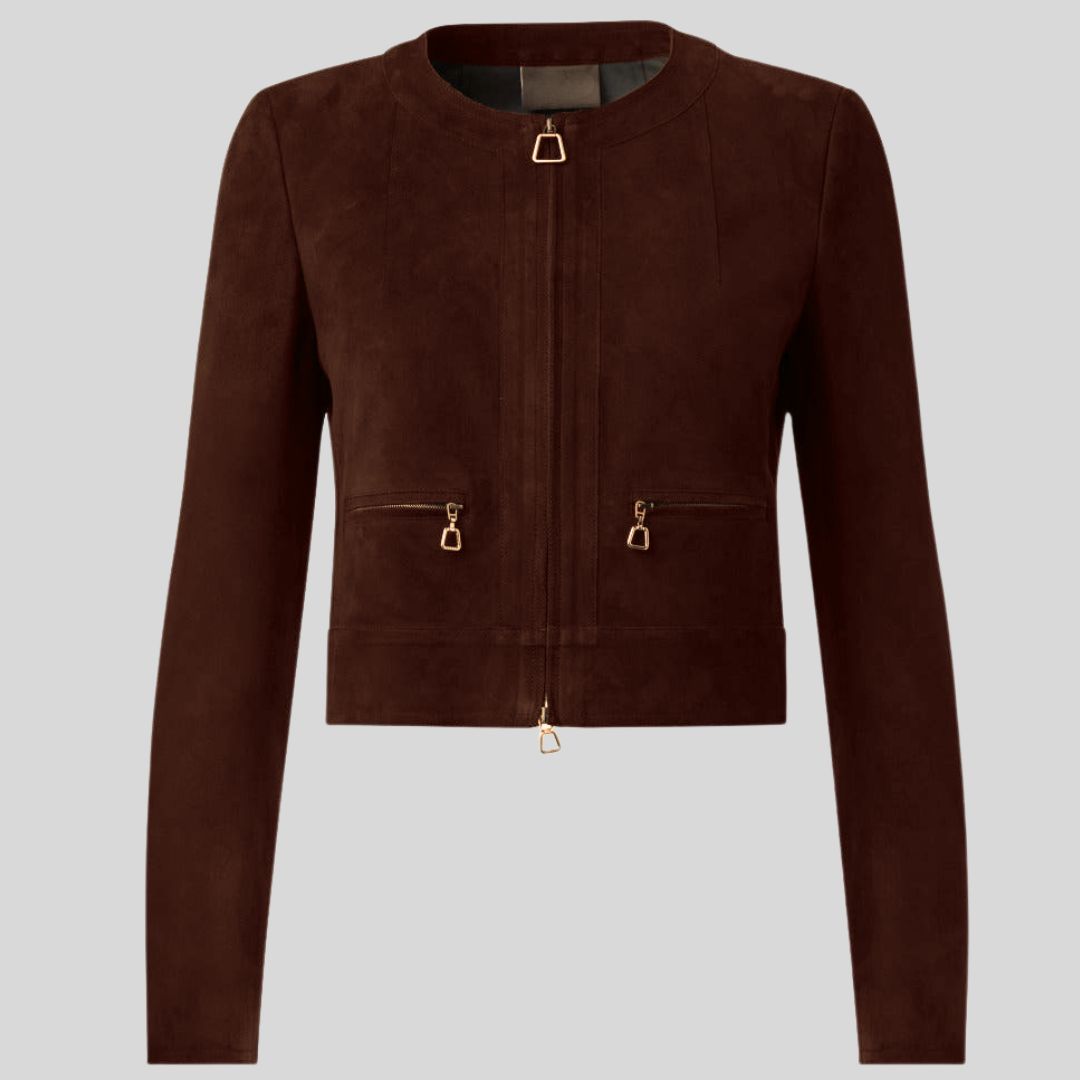 Brun Luxe – Veste Croppé en Daim Marron Foncé pour Femme