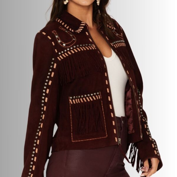 Découvrez notre veste longue en daim pour femme, confectionnée à partir de 100% de daim de chèvre pour une sensation luxueuse et un look élégant. Dotée d'un col à revers avec des surpiqûres, cette veste présente des détails de bordure ornés de surpiqûres et des franges le long des empiècements, des manches et des poches pour une touche de style bohème.