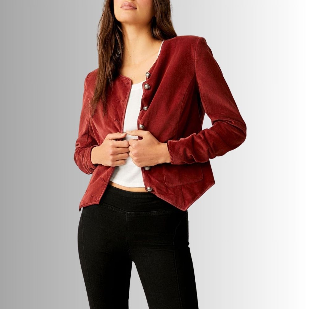 Veste Courte Femme Velours Rouge – Boutons Métal Chic